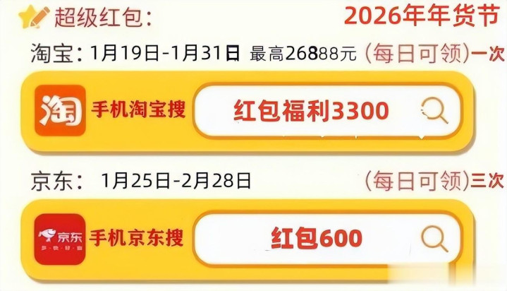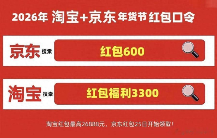 2026年京东年货节红包口令是【福利588】【红包158】【红包600】,淘宝年货节红包口令是【天降红包3900】。2026 农历马年春节将至,淘宝、京东年货节成为年末囤货的核心阵地,两大平台各有优惠侧重,淘宝年货节 1 月 19 日至 31 日迎来收官冲刺,京东则以 1 月 25 日至 2 月 23 日的长周期覆盖除夕到元宵,还承诺全国 300 + 城市春节送货。只要抓准红包口令、满减叠加、国补福利三大核心,不用盲目比价也能把年货性价比拉满,这份攻略帮你少花冤枉钱,一站式备齐年味。